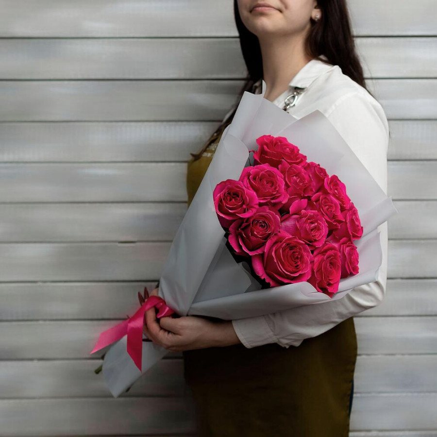лента (за1м) - 1 шт. пленка прозрачная (за1м) - 1 шт. упаковка в ассортименте (за1м) - 1 шт. роза эквадор 5 малиновый - 13 шт.
