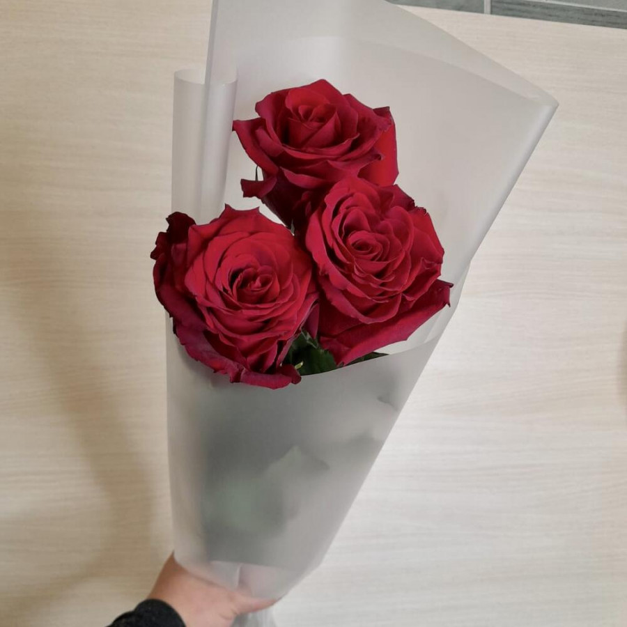 На фото букет из 3 бордовых роз. В составе: роза 3 шт, дизайнерская упаковка 1 шт, атласная лента 1 шт, . Все цветы свежие и ароматные, букет красиво оформлен и отлично подходит для подарка. Доступна доставка цветов или самовывоз.