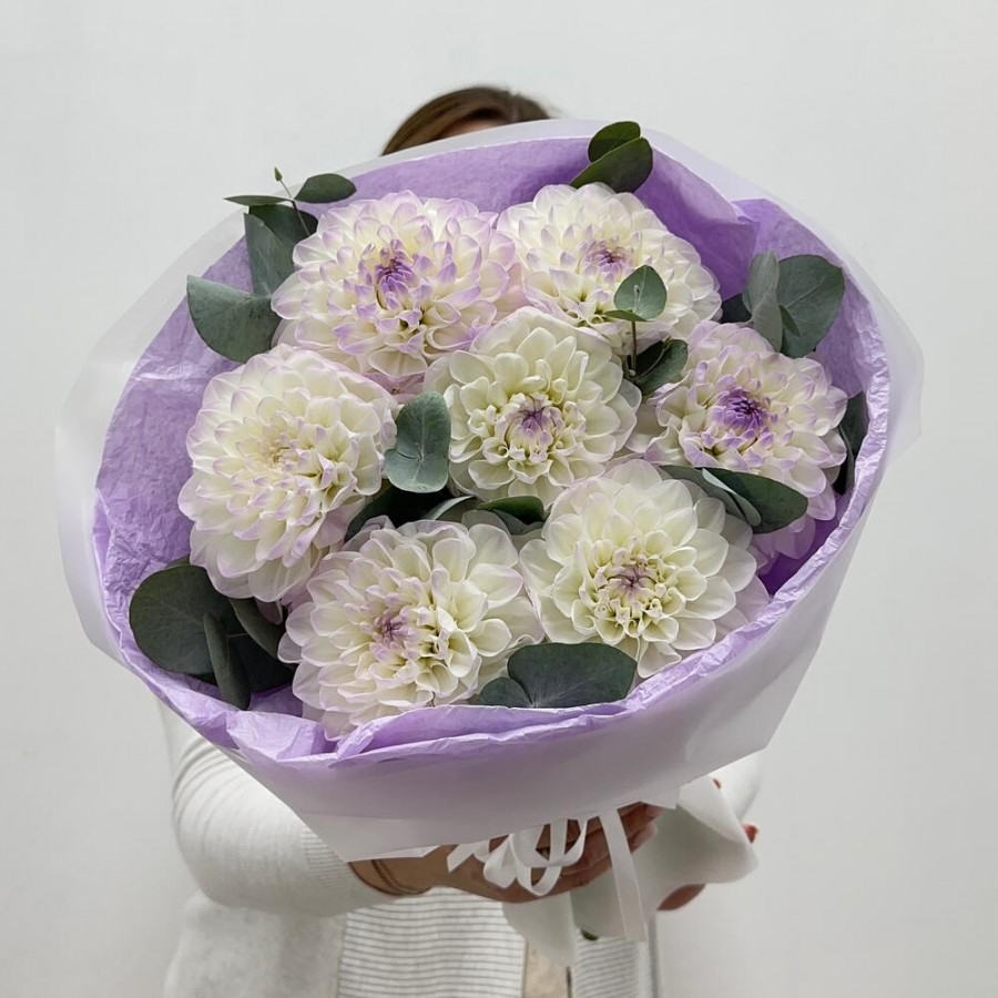 Букет из 7 бело-лиловых георгин с эвкалиптом