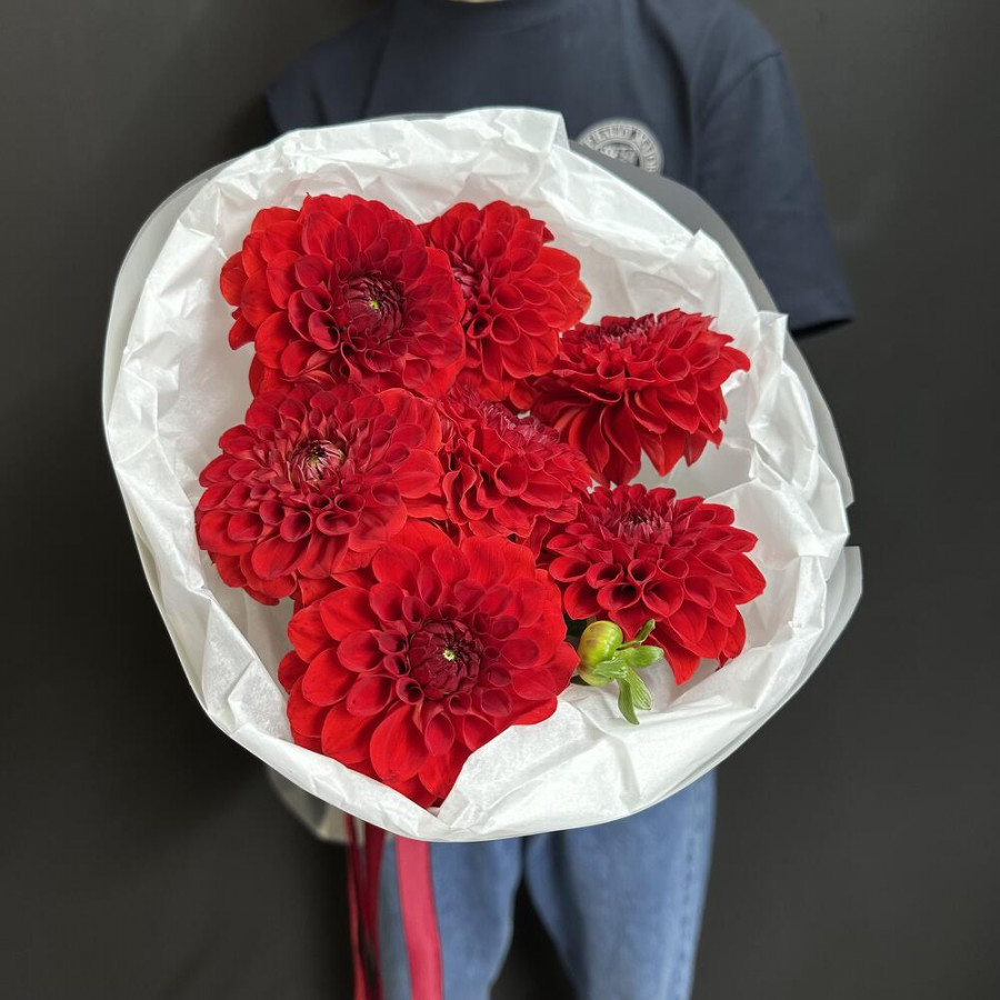 На фото букет из 7 красных георгин. В составе: георгина 7 шт, дизайнерская упаковка 2 шт, атласная лента 1 шт, . Все цветы свежие и ароматные, букет красиво оформлен и отлично подходит для подарка. Доступна доставка цветов или самовывоз.