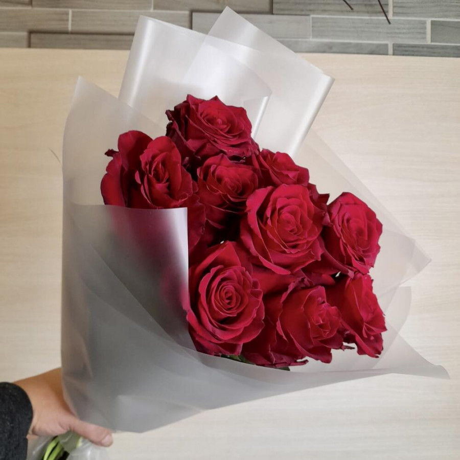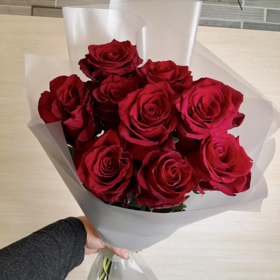 На фото букет из 9 бордовых роз. В составе: роза 9 шт, дизайнерская упаковка 1 шт, атласная лента 1 шт, . Все цветы свежие и ароматные, букет красиво оформлен и отлично подходит для подарка. Доступна доставка цветов или самовывоз.