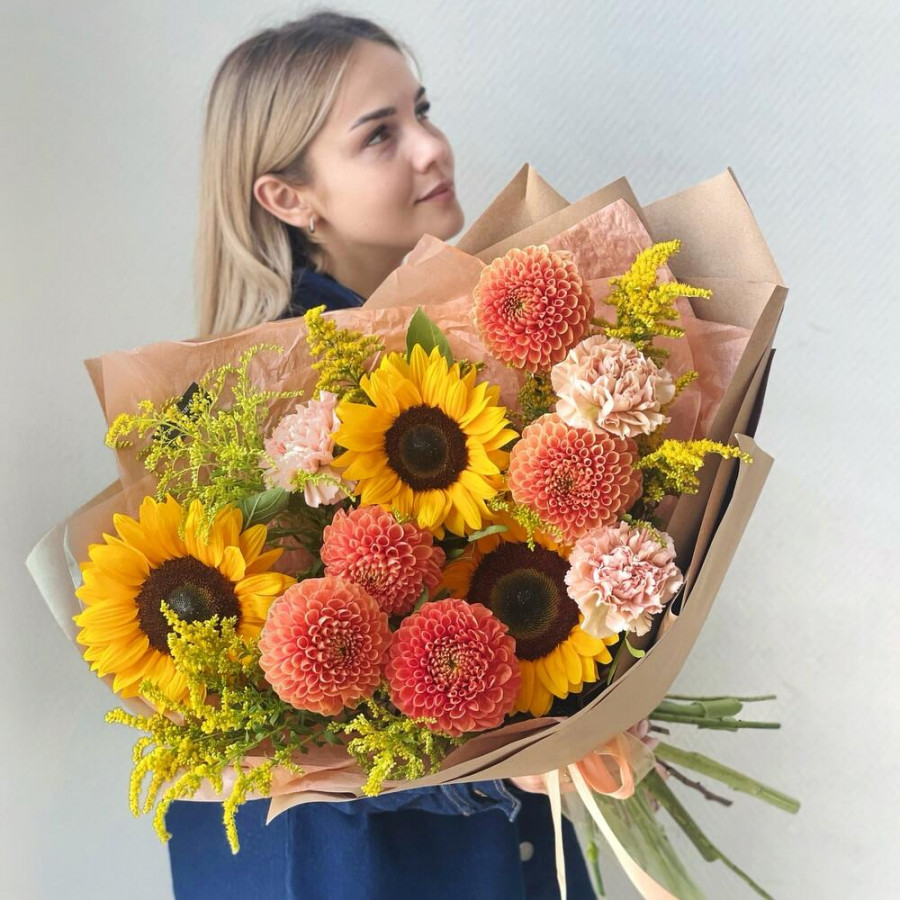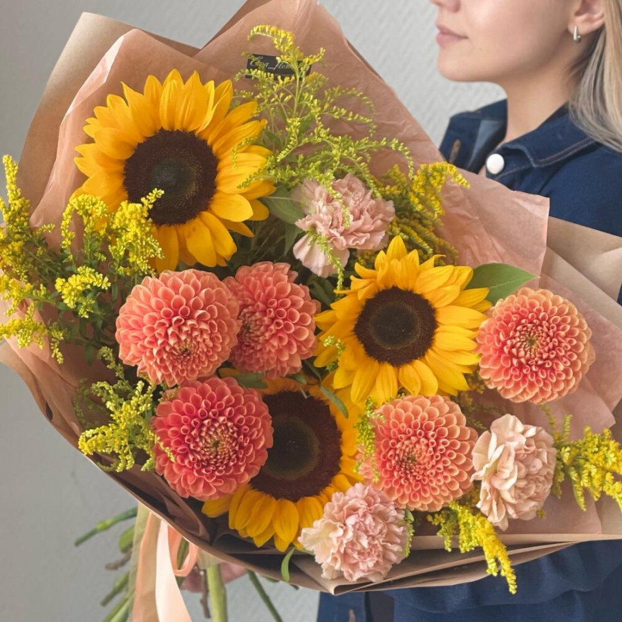 На фото букет из подсолнухов и георгин. В составе: георгина 5 шт, подсолнух 3 шт, солидаго 5 шт, гвоздика 3 шт, дизайнерская упаковка 1 шт, атласная лента 1 шт, . Все цветы свежие и ароматные, букет красиво оформлен и отлично подходит для подарка. Доступна доставка цветов или самовывоз.
