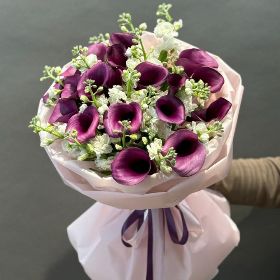 На фото букет «тайна полуночи». В составе: калла 20 шт, маттиола 5 шт, дизайнерская упаковка 1 шт, атласная лента 1 шт, . Все цветы свежие и ароматные, букет красиво оформлен и отлично подходит для подарка. Доступна доставка цветов или самовывоз.